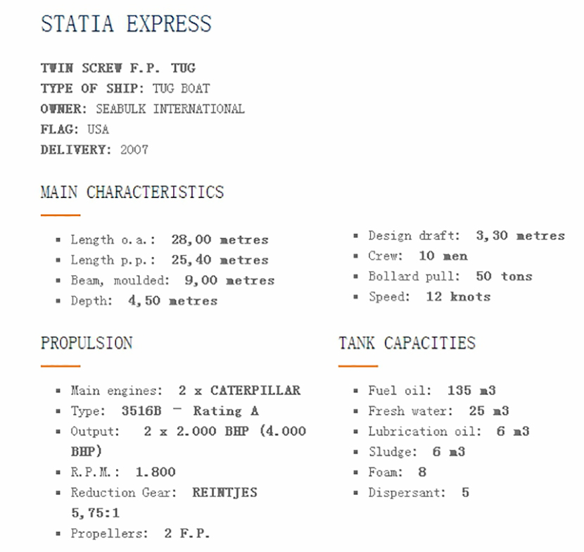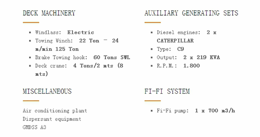 | 燃油容量: | 135m3 | 發(fā)動(dòng)機(jī)功率: | 2x2000bhp |