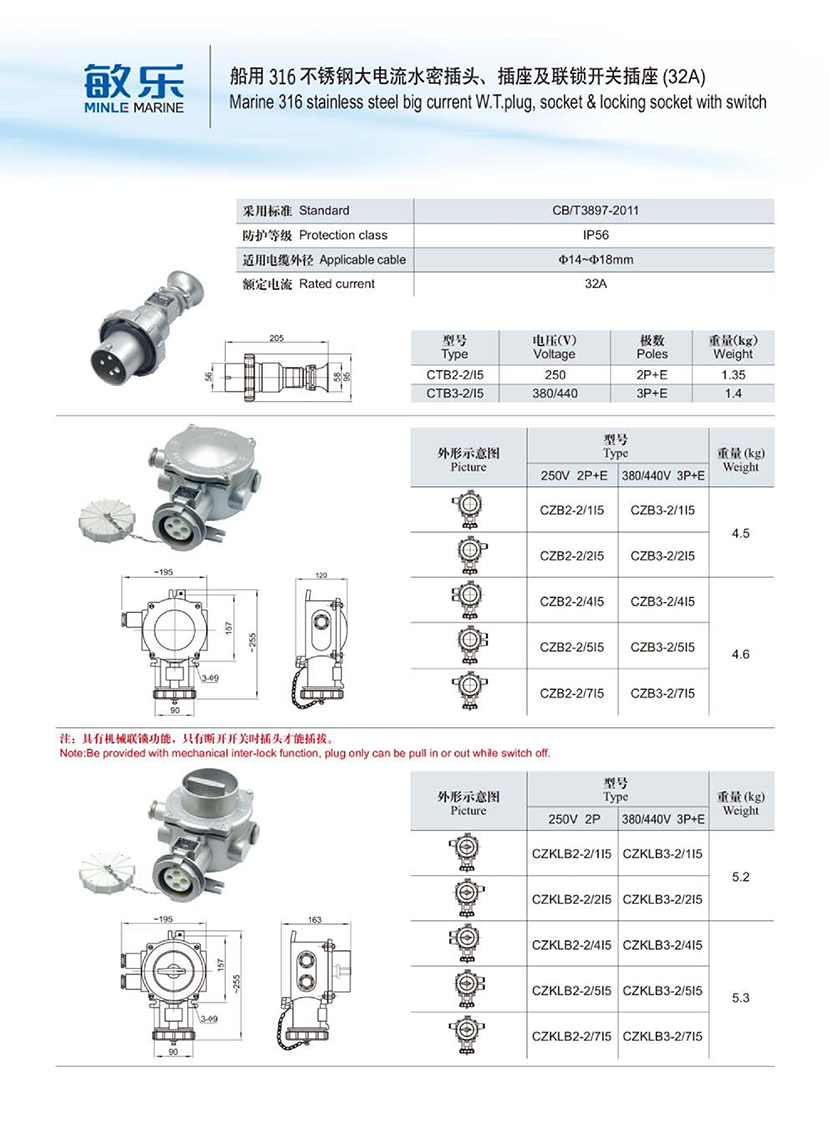 | 船用316不銹鋼大電流水密聯鎖開關插座(32A) | |||