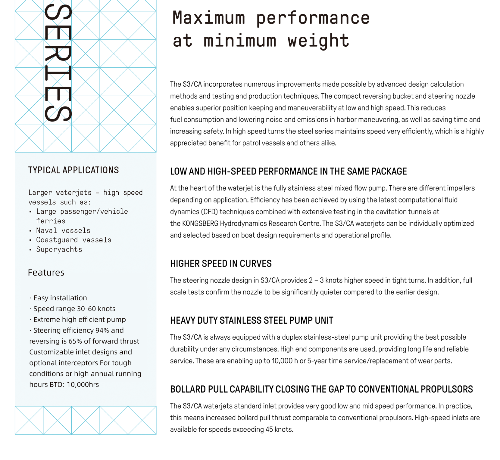 | 型式系列: | S3-CA系列 | 適用船型: | ·Fast ferries ·Patrol boats ·Yachts |